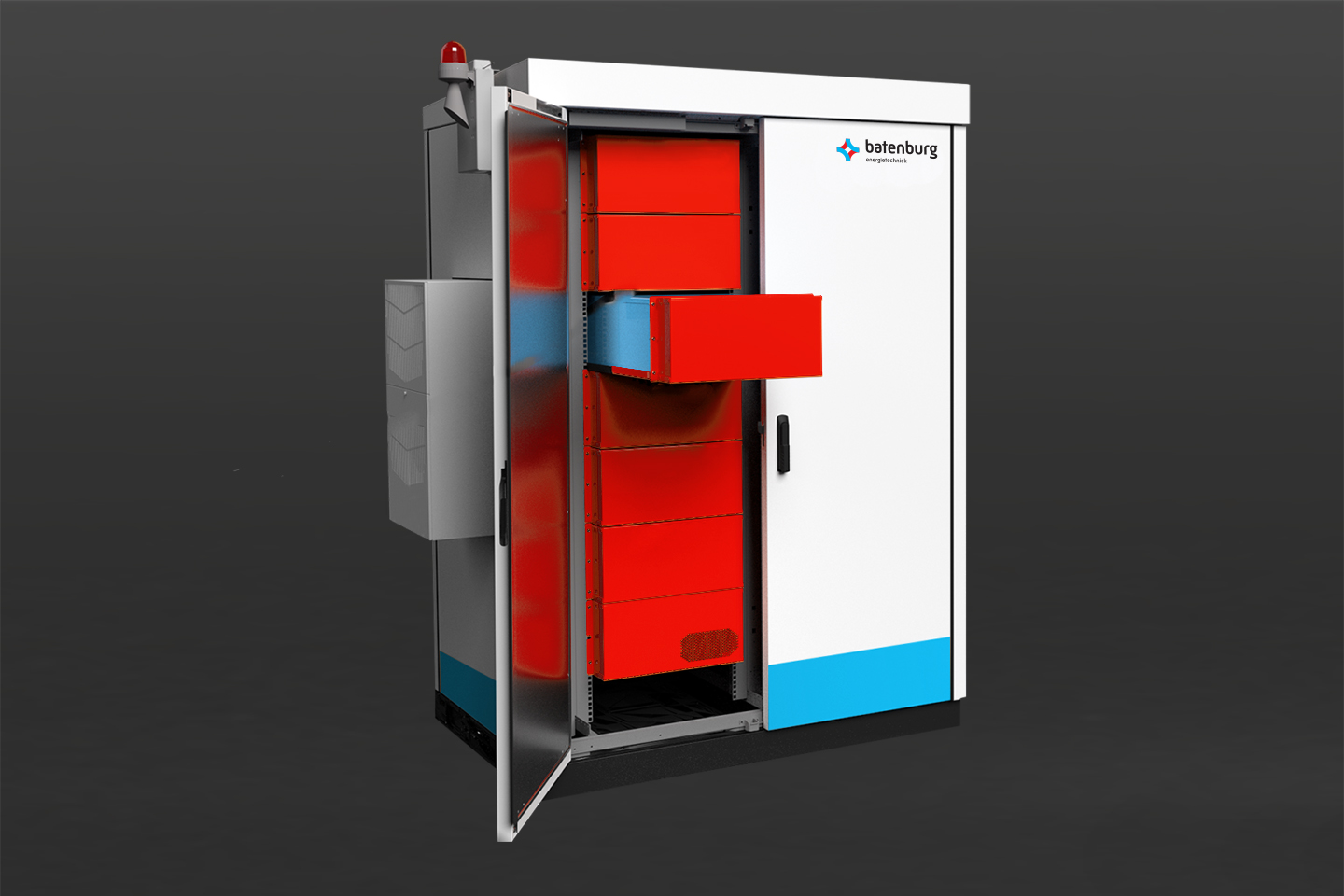 De batterijopslag is geschikt voor alle weers- en omgevingsomstandigheden. Stalvuil is geen probleem. Brand-, bliksem- en buitenbescherming IP 54.